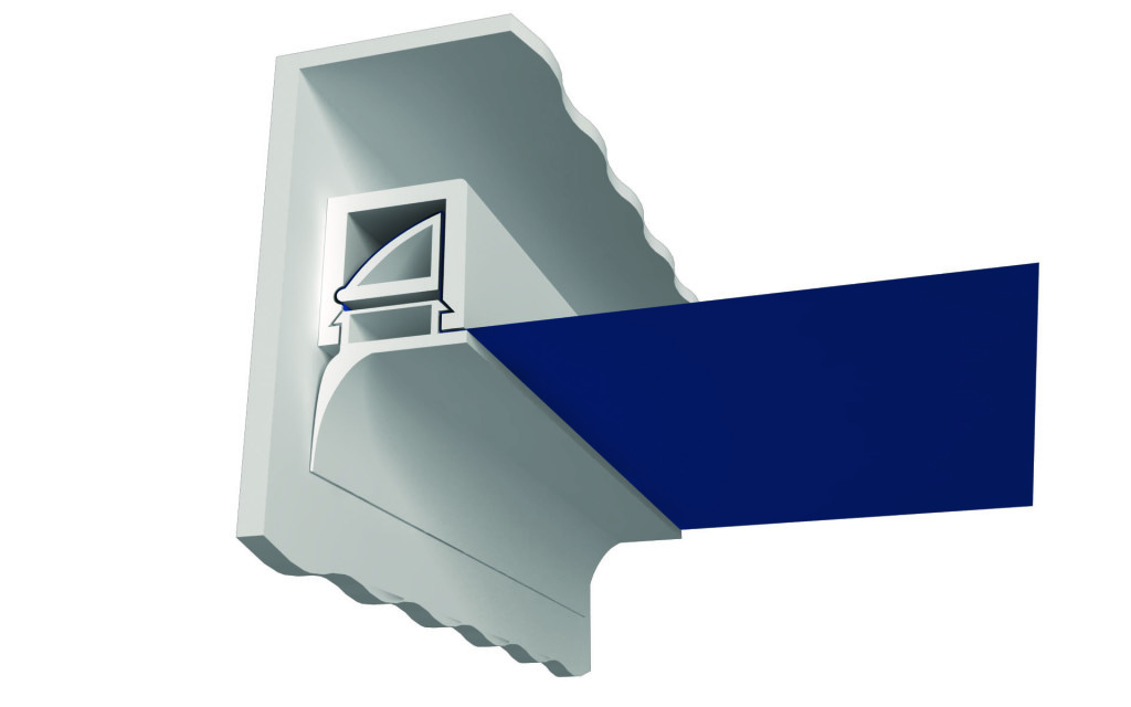 - другим распространенным методом фиксации полотна является клиновый, применяемый при использовании профиля с двумя посадочными пазами, один из которых используется для посадки так называемого клина, а другой — для установки декоративного элемента в виде продольной планки. В этом случае пленку закладывают в паз и прижимают клином. И так по всему периметру помещения. На следующем этапе в соседний паз устанавливаются декоративные элементы, придающие крепежному устройству дополнительной жесткости. Поскольку края полотна могут выглядывать из профиля, лишний материал необходимо аккуратно удалить, срезав его острым ножом;